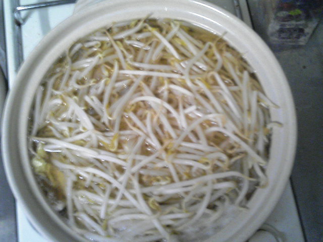 最近とっても寒いです。 そうです、お鍋がおいしい季節になってまいりました。 今回は寄せ鍋 ・・・どうみてももやし鍋です、本当に(ry 前回、もやしを先に入れてしまい、 他のものが入らなくなった教訓を生かし、 もやしを最後にして、入らなかったら 後から足していこうとしたら、なんかと収まったのですが、この有様 本当はこの下に白菜とか鶏肉とか入っているのですよ。 鍋は体があったまります。 しばらくは鍋でいいかもしれん。